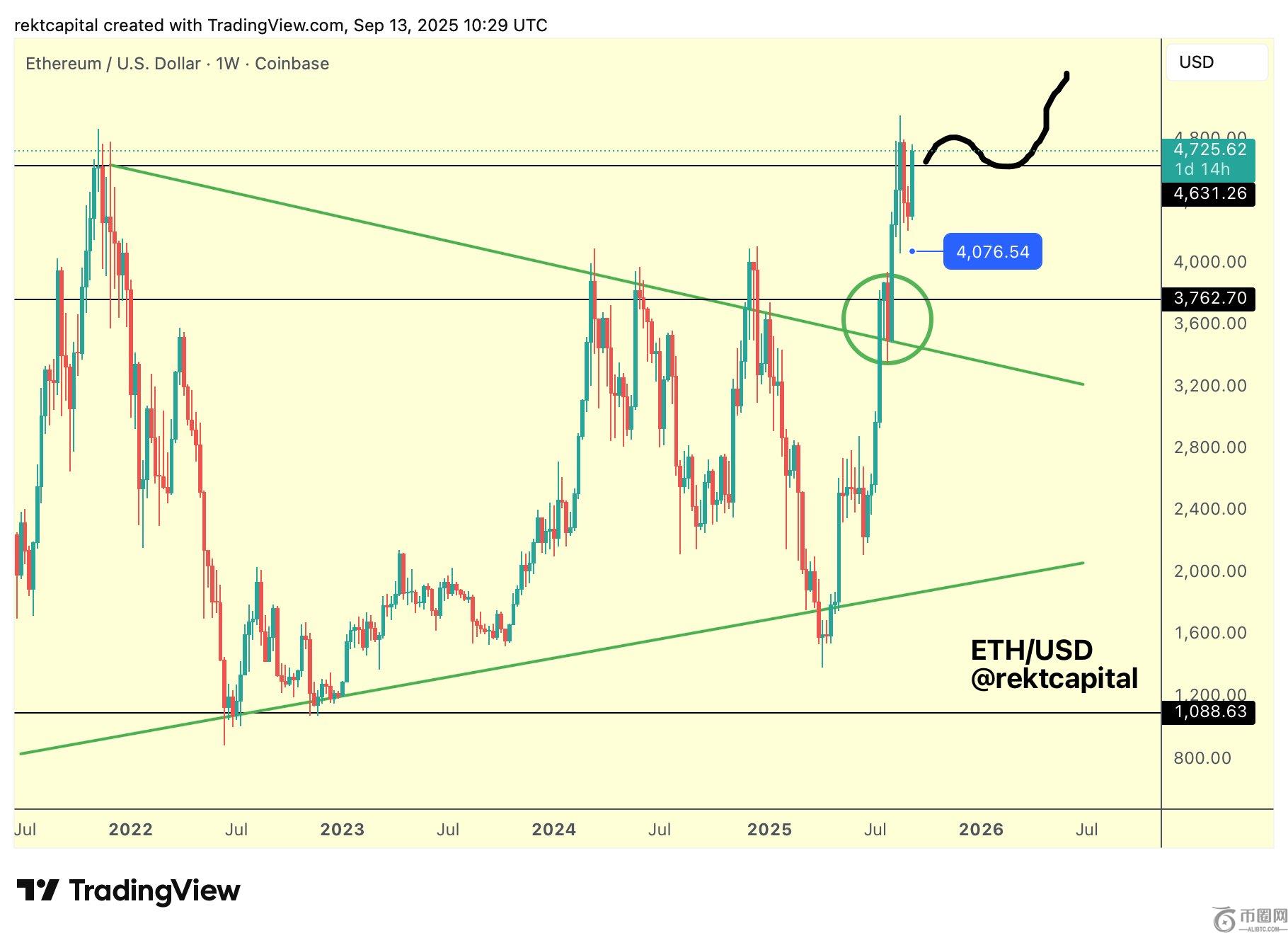 匿名分析师 Rekt Capital 向 十 上的 558,500 名粉丝表示,他认为以太坊需要将 4,613 美元的阻力位转变为支撑位,为突破并创下历史新高奠定基础。