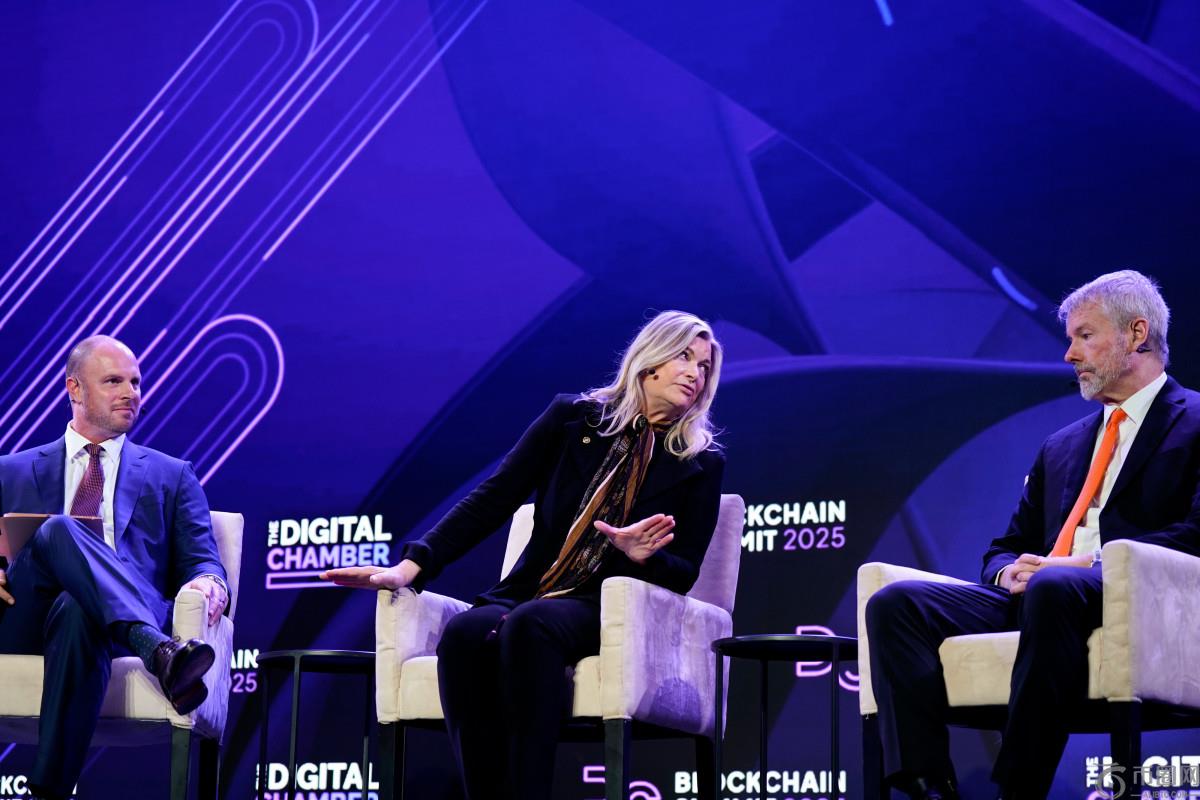 2025 年 3 月 26 日星期三,在美国华盛顿特区举行的 DC 区块链峰会上,Riot Platforms **执行官 Jason Les(从左至右)、怀俄明州共和党参议员 Cynthia Lummis 和 MicroStrategy Inc. 联合创始人兼执行主席 Michael Saylor。此次峰会汇集了政策制定者和**影响者,共同探讨加密行业面临的最重要问题。