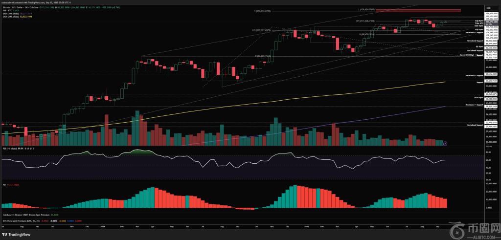 Nik 的更高时间范围读本周收盘强劲,收复了8月份开盘价11.53万美元附近的高点,并且至关重要的是,价格维持在11.2万美元上方。“这现在是短期看涨的底线,”他写道,并警告称,如果周收盘价回落至11.2万美元下方,将重新开启通往7月份局部低点10.7万美元左右的通道,如果跌幅更大,则可能触及9.9万美元的波动低点。就上行而言,他强调11.75万美元将是下一个拐点;如果能突破12万美元,将迅速创下历史新高,而12.3万美元是日线图上的**个主要上限。