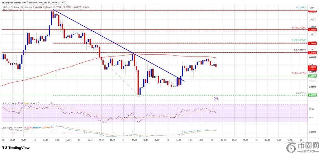 XRP 价格在 3.050 美元阻力位下方开始下行修正。目前价格正在收复失地,并在 3.080 美元附近面临阻力。