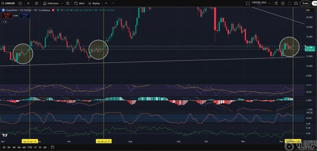 当前市场结构与技术指标与先前的突破前形态高度吻合,这增强了市场对LINK可能即将再次突破的预期。加密货币分析师里克·巴伯指出,当前指标位置与上次突破前的状态极为相似。他强调,虽然这种形态不能保证必然突破,但重复出现的模式值得**关注。