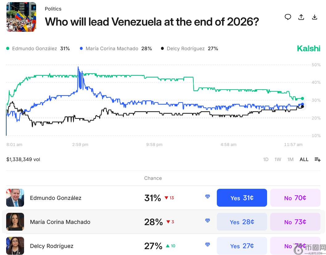 马查多在Kalshi的预测概率曾在周六短暂反超冈萨雷斯,但因特朗普公开质疑其领导能力而回落。特朗普表示:“她缺乏**支持与威望,虽为人友善但难以胜任领导职责。”