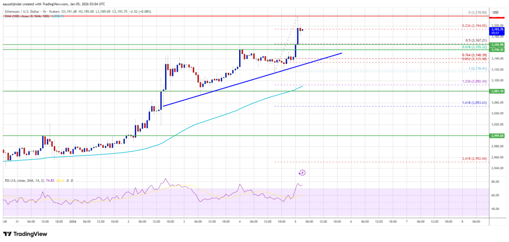 以太坊在稳定站稳3000美元大关后开启新一轮上涨行情,迅速突破3050美元和3120美元的关键心理与技术阻力位。当前价格位于3100美元上方,并运行于100小时简单移动平均线之上,显示出较强的支撑力。