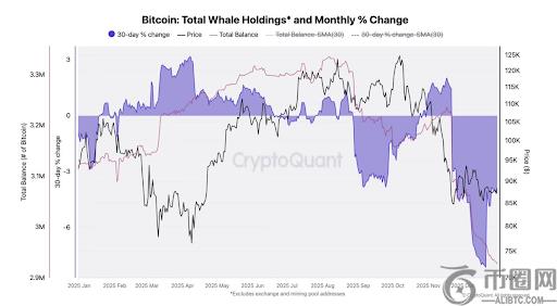 根据CryptoQuant链上数据分析,剔除交易所与矿工地址后,持有大量比特币的巨鲸地址在过去一年中整体余额不断缩减。这一趋势贯穿全年,尤其在下半年更为明显。尽管1月曾出现小幅回升,但未能形成持续积累动能。