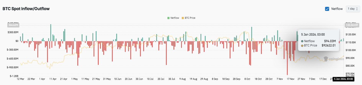 现货资金流动数据也传递积极信号。尽管多数时间处于资金流出状态,但在盘整阶段出现间歇性流入。1月初录得近9400万美元净流入,标志着需求改善,抛压减轻,进一步支撑短期价格稳定。