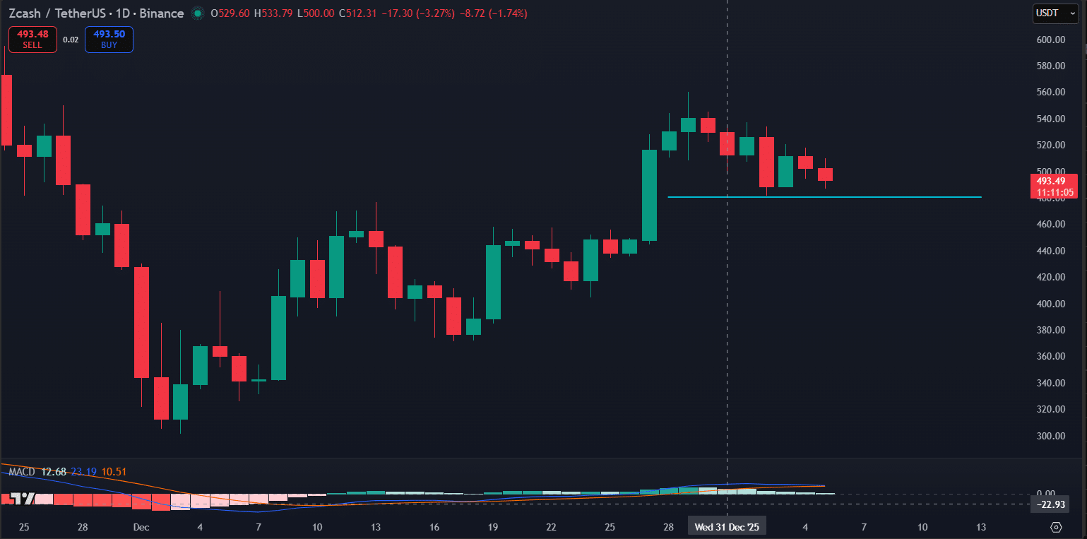 截至发稿,ZEC已从此前超过530美元的高点大幅回调,当前价格稳定在493美元附近波动。