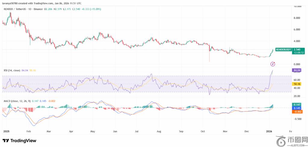 日线图显示,RENDER价格具备明显的看涨动能,表明市场购买需求旺盛。短期上行阻力集中在2.80美元至3.00美元区间,该区域对应历史压力位;若出现回调,2.00美元为即时支撑,更下方的1.7美元则构成较强支撑区域。