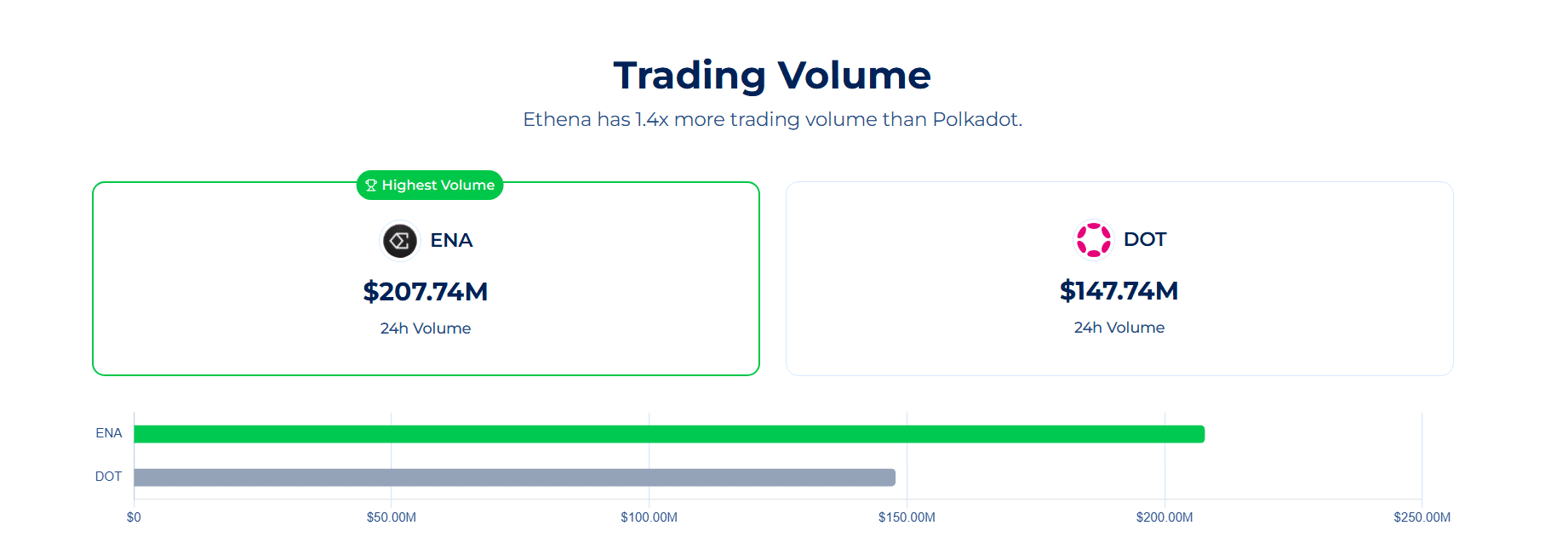 过去24小时内,Ethena的交易量约为2.07亿美元,而Polkadot的交易量为1.47亿美元。简而言之,ENA的交易量远高于Polkadot。