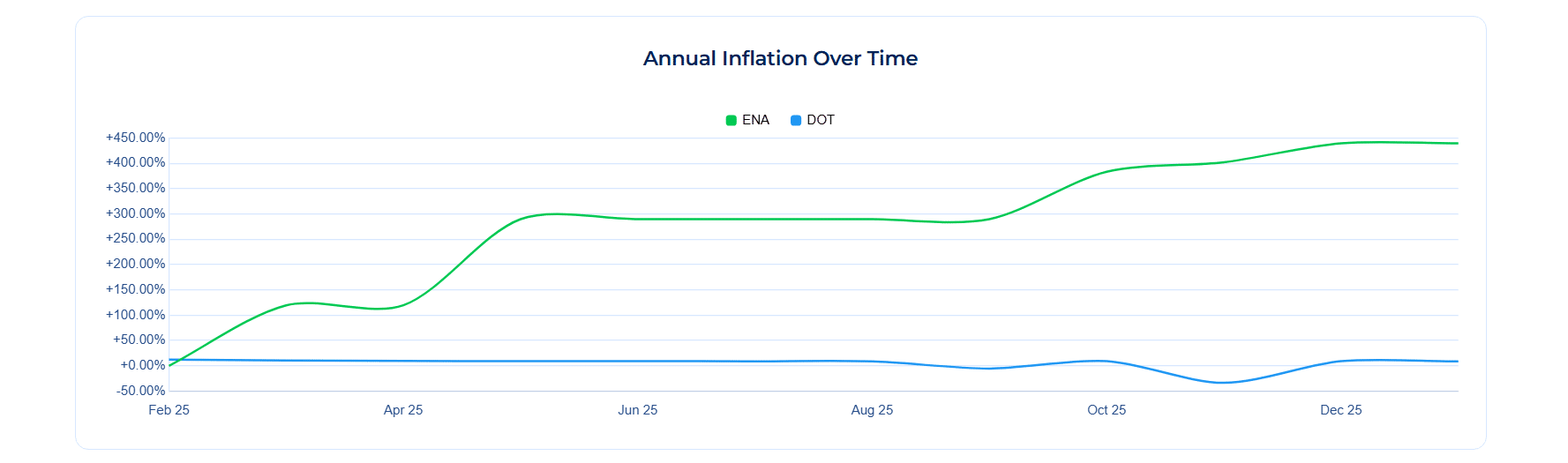 Ethena 的年度通胀率在过去一年中持续攀升,超过 400%;**发行和分发速度也很快。这种不断扩大的供应量有助于解释为什么 ENA 需要持续的需求来支撑其价格走势。
