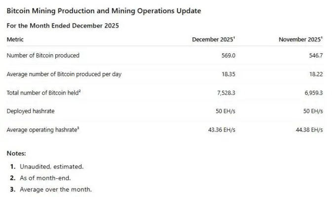 衡量区块链网络计算能力的关键指标——哈希率在2025年12月实现显著提升。这一变化得益于有利的网络难度调整,使比特币日产量稳定增加。截至12月底,Cango的比特币总持有量达到7,528.3 BTC,较前月进一步增长,反映出其挖矿效率的持续优化。