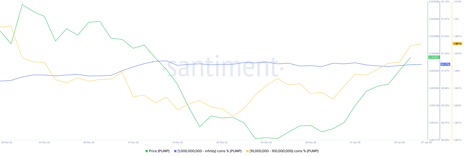 链上数据显示,大型钱包投资者保持稳定,而中型钱包交易活跃度的增加则推动了PUMP价格上涨。据Santiment统计,持有超过10亿枚PUMP**的持有者掌握了超过91%的链上供应量。