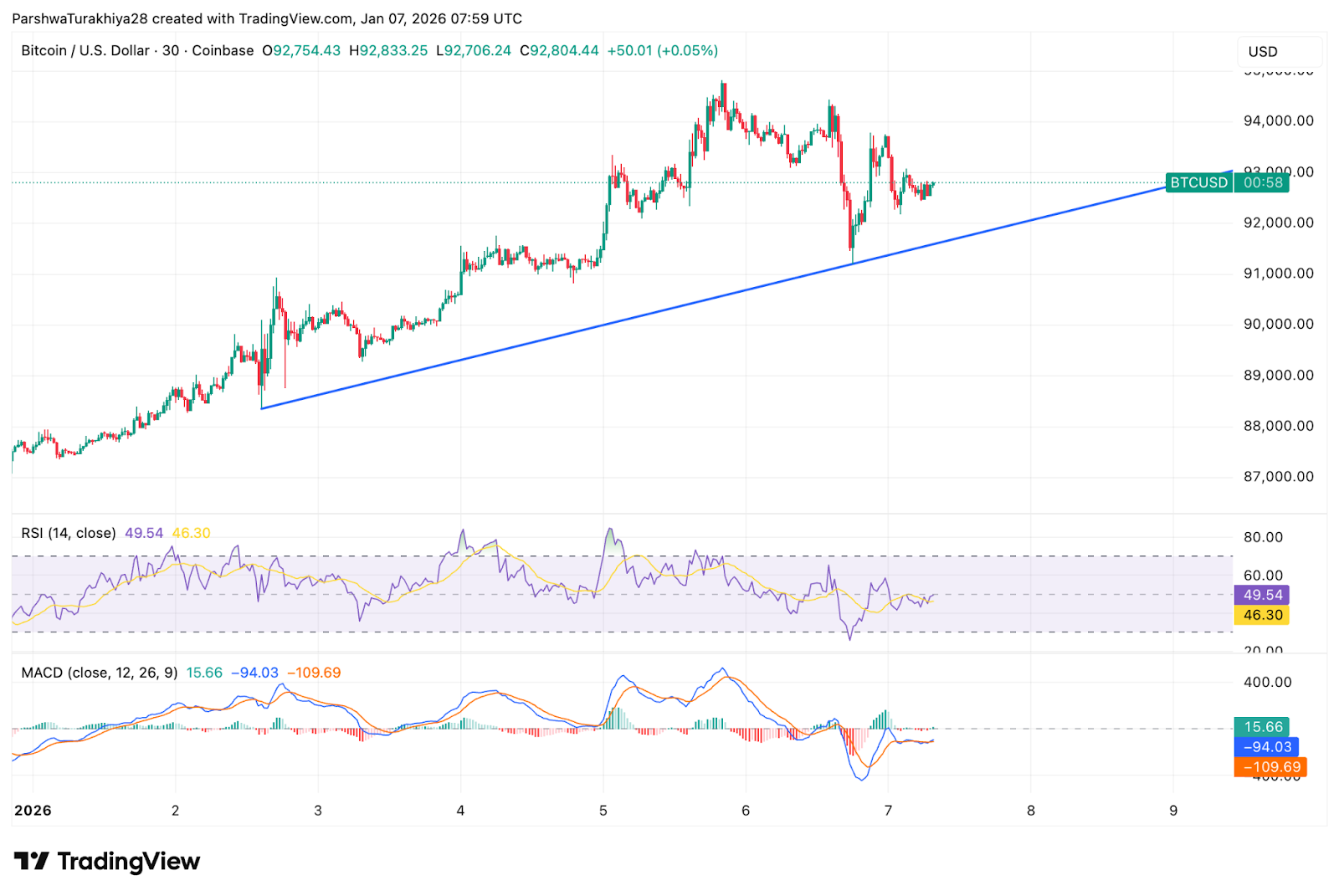 比特币价格今日在92,800美元附近震荡,未能突破短期阻力位,回落在脆弱的盘整区间内。由于现货资金持续外流,上涨动能受限,卖方保持活跃;买方则聚焦于守住90,000至93,000美元的支撑区,以防止进一步下行。