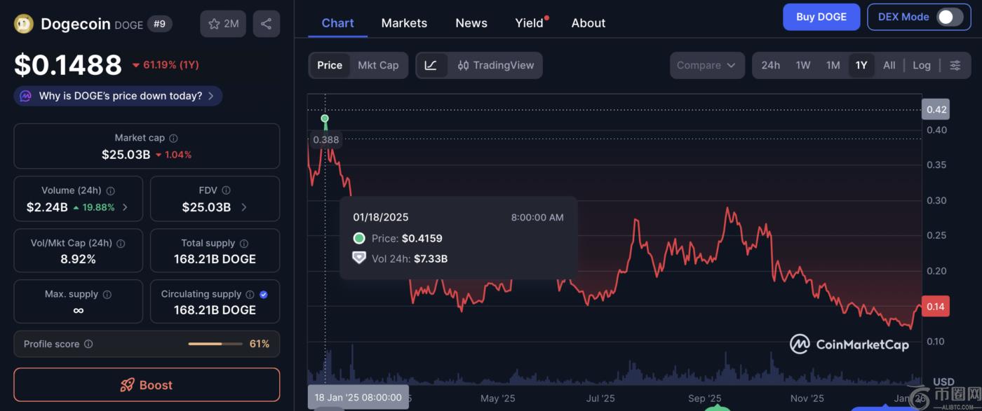 这一看跌预期源于其缺乏基本面驱动因素、生态系统建设滞后以及社会情绪降温。与柴犬币(Shiba Inu)推进Shibarium第二层网络不同,狗狗币仍沿用2013年的原始代码库,未进行重大协议升级。**供应机制带来的持续挖矿压力,使**流通量不断扩张,除转账外几乎无实际交易效用。