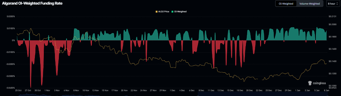 在衍生品方面,Algorand 提供资金利率支持看涨观点。Coinglass 的未平仓合约加权资金率数据显示,押注 ALGO 价格将进一步下跌的交易者数量少于预期价格上涨的交易者数量。
