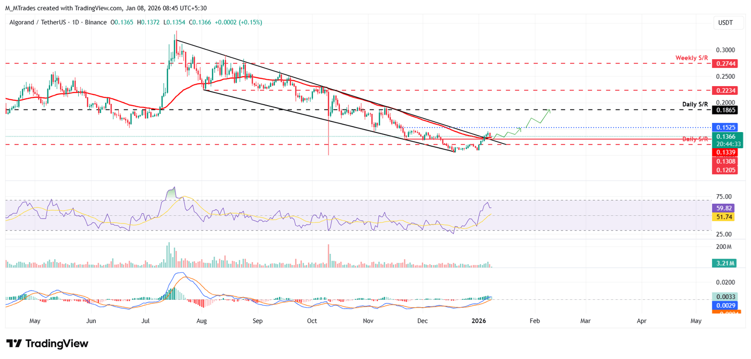 如果大致与 50 日指数移动平均线 (EMA) 重合的趋势线(位于 0.133 美元附近)能够守住支撑,ALGO 股价有望延续涨势,向下一个日线阻力位 0.152 美元迈进。若收盘价成功突破该阻力位,则有望进一步上涨,向下一个关键阻力位 0.186 美元迈进。