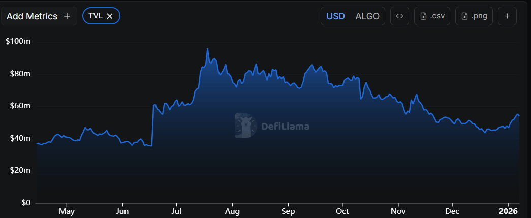 DefiLlama数据显示,自12月中旬以来,Algorand的总锁定价值(TVL)持续增长,目前已达5470万美元。TVL的增长表明Algorand生态系统的活跃度和用户兴趣日益浓厚,这意味着越来越多的用户正在基于ALGO的协议上存入或使用资产。