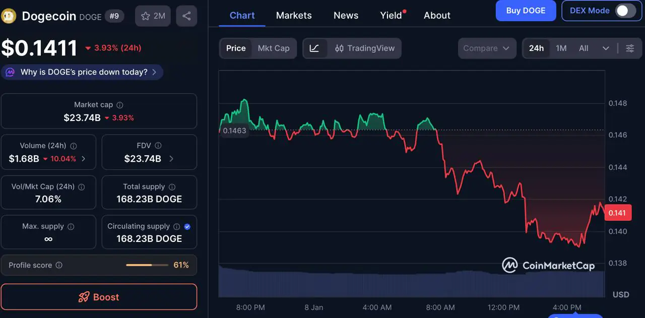 市值以0.14美元的价格出售的狗狗币已经展现出了其韧性。与此同时,佩佩托($PEPETO)该项目以 0.000000176 美元的价格启动预售,提供早期投资机会,并拥有完善的公用设施基础设施。本文将分析哪家公司更有潜力将小额投资转化为高额回报。狗狗币市场份额及发展报告