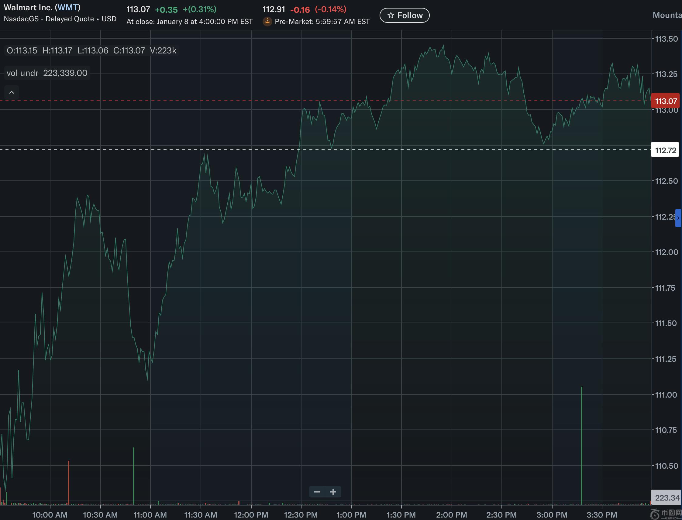 日内图表显示沃尔玛交易区间相对狭窄,早盘走强后,股价在112.70至113.00美元区域上方企稳整理。全天价格走势保持稳定,表明市场反应审慎而积极,并未出现激进的投机性买盘。