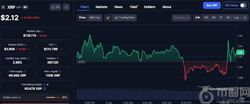 尽管获得监管批准,Ripple原生**并未呈现积极市场反应。**数据显示XRP交易价格为2.12美元,24小时内下跌0.43%。日内价格曾波动至2.14美元高点,随后回落至当前价位。