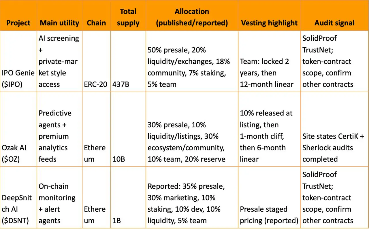 IPOGenie、Ozak AI 和 Deepnitch AI 之间的比较,并揭示了 2026 年值得关注的早期 AI **。因此,为此,我们尽可能使用官方**经济学页面和审计仪表板,并标记**仅“已报告”的内容。