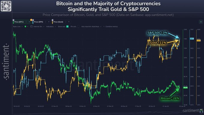 根据Santiment的数据,过去三个月内,黄金价格上涨约11%,标普500指数上涨约3%,而比特币则下跌近26%。这一分化现象表明,当前市场尚未进入加密资产主导阶段,反而可能正酝酿新一轮反弹。