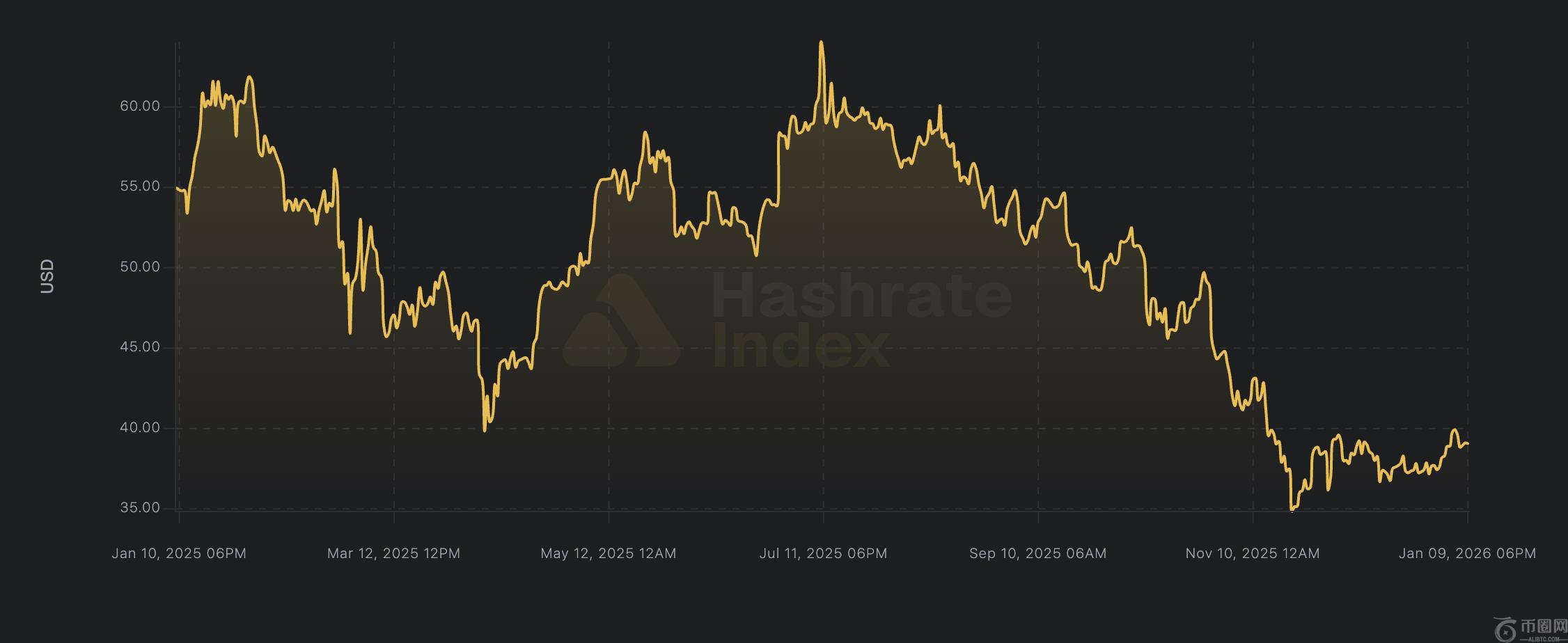 关键指标——哈希价格(即每petahash-second每日预期收益)在2025年11月跌破盈亏平衡线,一度低于35美元。业内通常以每日每PH 40美元为关机阈值,该数据创下多年新低,引发大量矿机停摆与设备出售潮。