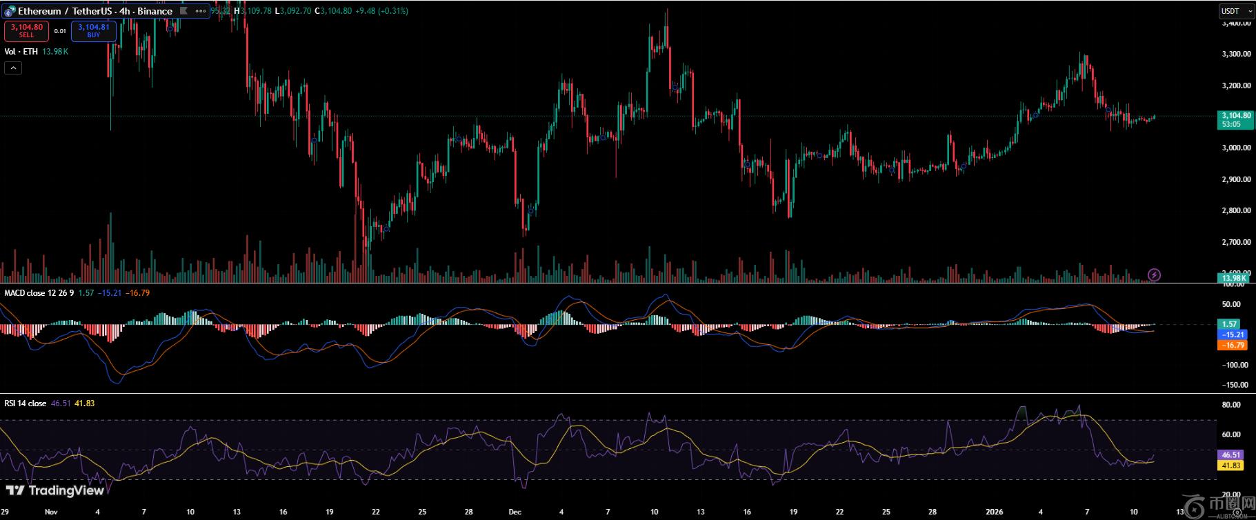 从技术角度看,以太坊的指标反映出平衡状态而非动能耗尽。在4小时图上,MACD动量在先前看涨阶段后已趋于平缓,表明市场处于盘整而非趋势逆转。直方图读数仍接近中性,暗示空方并未掌控局面。