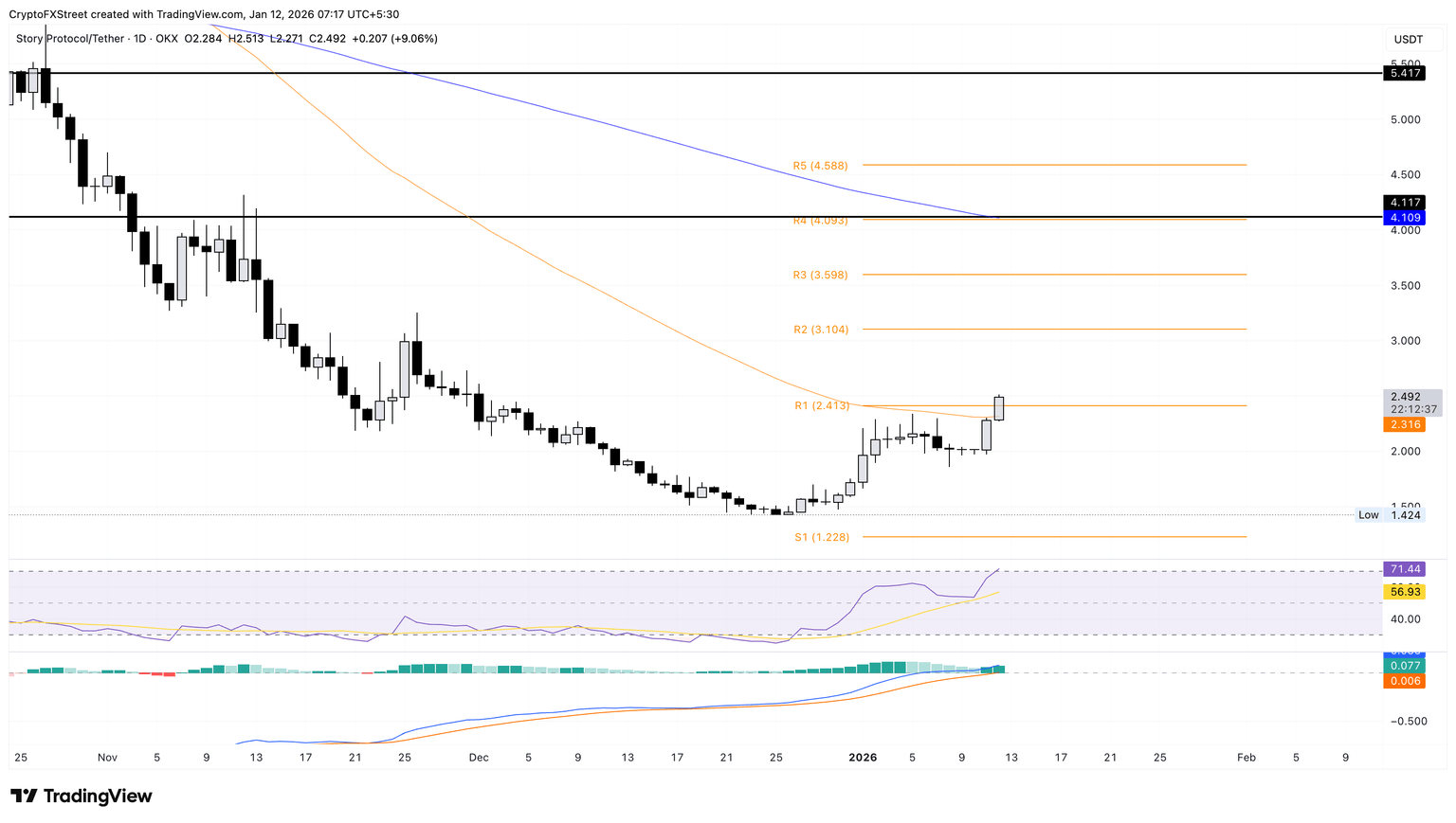 截至周一发稿时,Story 股价上涨 9%,在周日上涨 13% 后,突破了 50 日指数移动平均线 (EMA) 2.31 美元。该网络迷因币已突破 R1 枢轴点 2.41 美元,并正逼近 2.50 美元。