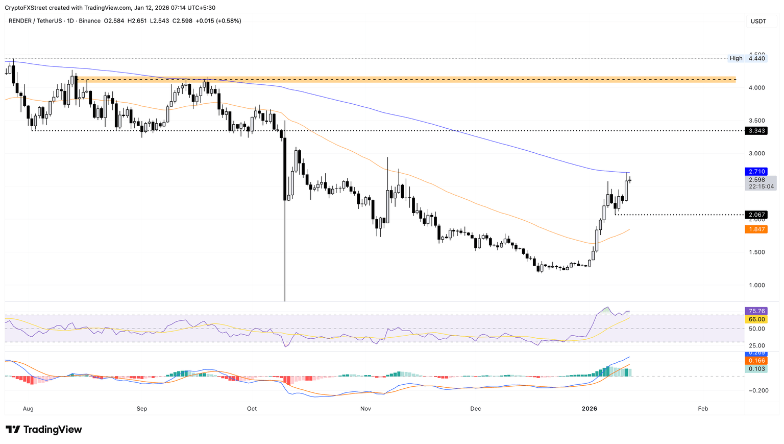 Render 1 月份的上涨行情触及了 200 日均线阻力位。