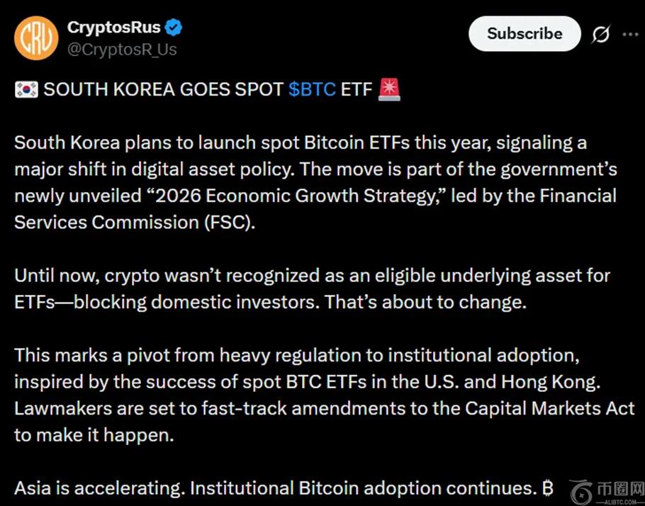 随着韩国宣布将推进现货比特币ETF的计划,全球加密市场再度聚焦亚洲关键经济体的政策动向。这一转变意味着该国从以往严格的加密监管环境逐步转向支持性立场,为机构资金流入比特币打开通道。