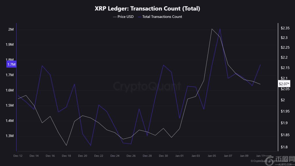 值得注意的是,XRP网络总交易笔数在经历短暂冷却期后再度回升。这一现象发生在价格盘整期间,说明真实用户参与度提升,非单纯投机行为驱动,反映出生态活跃度正在改善。