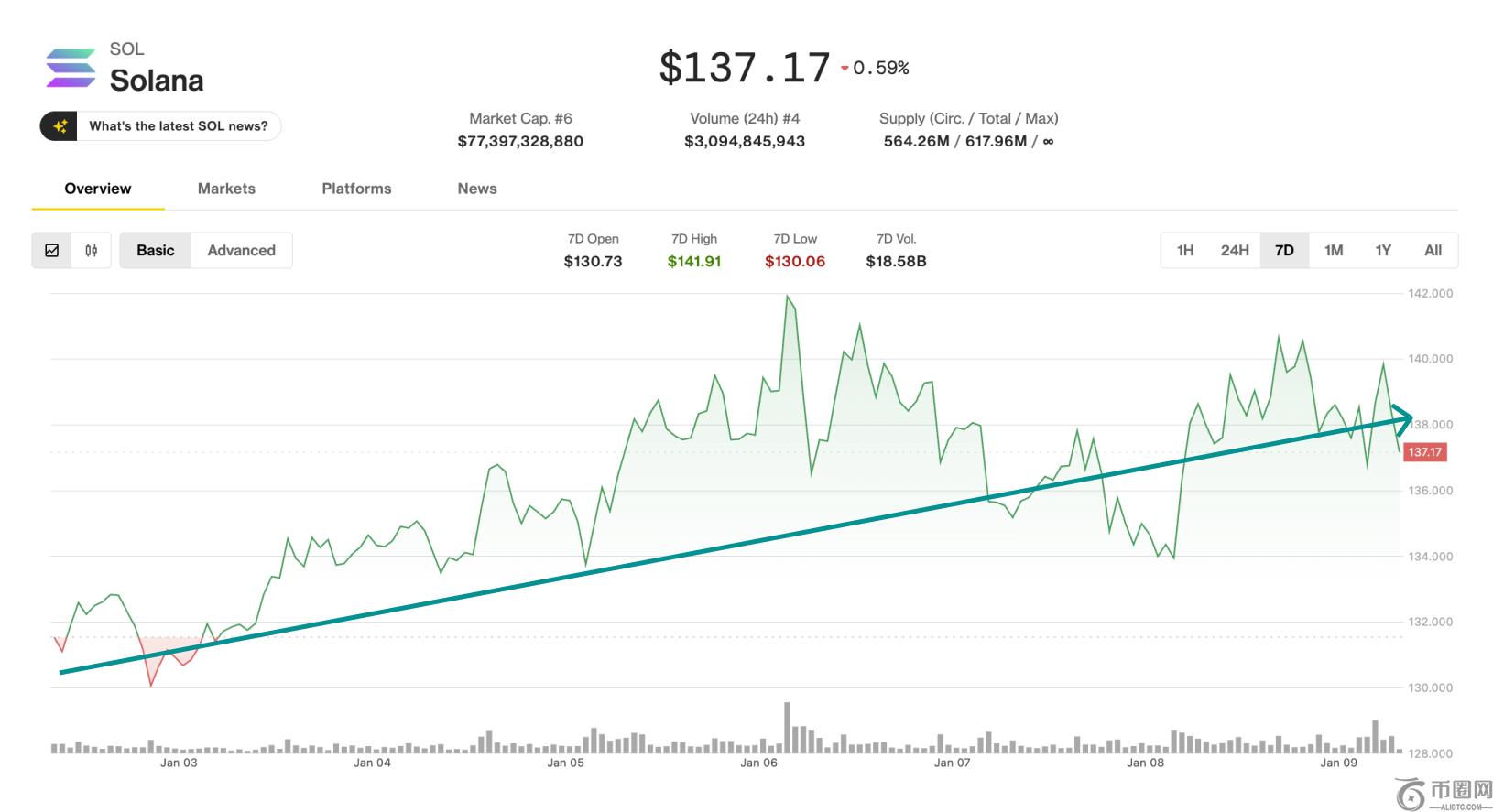 得益于上述消息,短期的Solana价格预测有所改善,但其今年的价格轨迹原本就已呈现积极态势。该**价格从1月1日的125.05美元跃升至1月9日的137.17美元,近10%的涨幅确认了看涨势头。