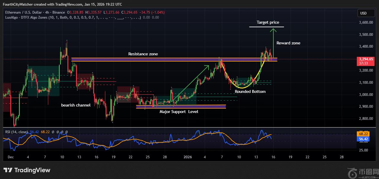 技术结构表明,只要以太坊能维持在3,300美元支撑上方并持续吸引买盘,则具备继续上行动能。短期交易者可关注小幅回调带来的入场机会,而RSI等动量指标有助于研判趋势强度是否足以抵达目标区域。