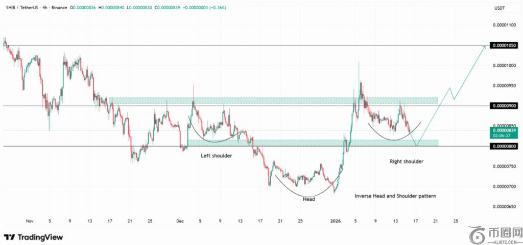 从4小时图看,柴犬币已形成头肩底形态——这种技术结构通常在卖压减弱时出现。形态的左肩形成于去年12月,随后12月下旬的下跌构成了头部。尽管最初呈现下跌趋势,但价格很快回升,表明市场情绪发生变化。