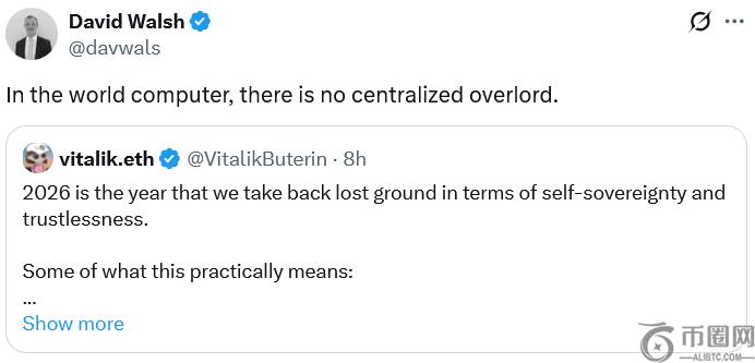 “2026年将是我们收复自主权与免信任领域失地的一年,”布特林周五在X平台发文强调,“从今往后,以太坊至此做出的所有价值妥协——每一个可能让你怀疑‘为迎合主流是否值得如此稀释自我’的时刻——都将被终结。”