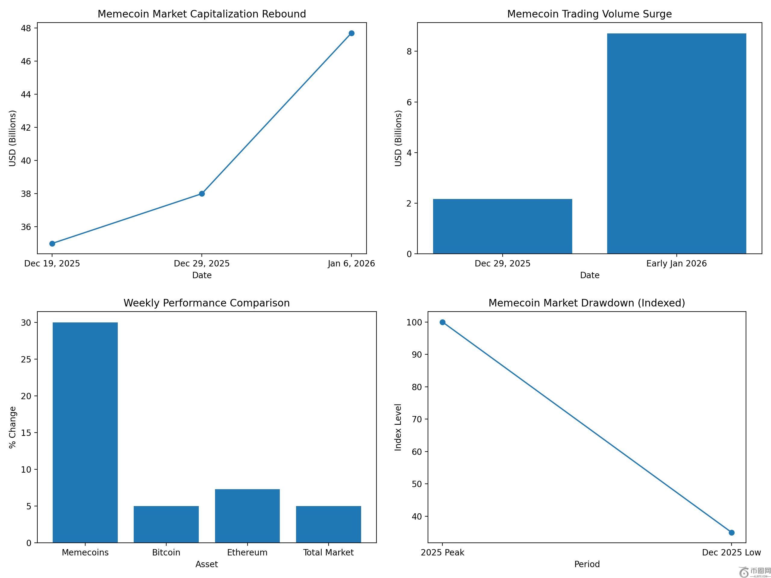 右下:迷因币市场回撤(指数化)通过显示该板块仍比2025年峰值低约65%,将反弹置于背景中审视。
