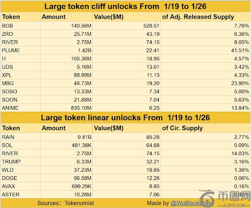 据数据显示,在1月19日至1月26日期间,预计将有总值超过10.54亿美元的加密货币**解锁。其中,BGB以释放价值约5.2851亿美元的1.4056亿枚****一次性悬崖解锁,占其调整后供应量的7.76%。RAIN则在线性解锁中**,将释放价值约8528万美元的94.1亿枚**,占其流通供应量的2.77%。RIVER同时出现在两类解锁中,合计解锁价值约1.483亿美元,对供应量的影响超过22%。在悬崖解锁中,PLUME、MBG和ANIME的相对供应量增幅**,分别达41.51%、23.90%和13.84%。