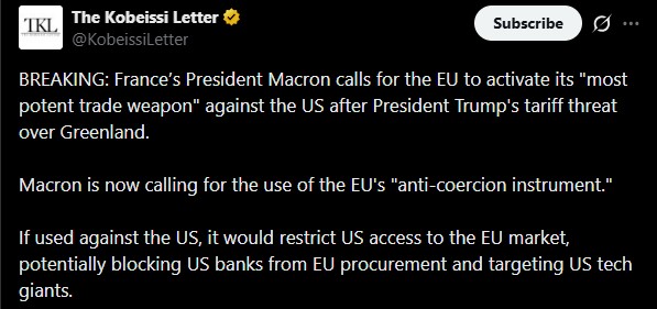 法国总统马克龙呼吁欧盟启动其强大的“反胁迫工具”,这一贸易武器旨在打击利用定向关税和投资限制进行的经济讹诈,这无疑为当前的局势火上浇油。