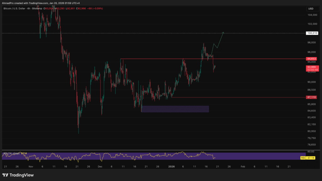比特币再次在94,500至95,000美元区间遭遇强劲阻力,连续冲击均被拒绝。最近一次受阻后引发快速回调,价格回落至区间中部,短期上涨动能已被扼杀。