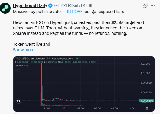 许多人认为Hyperliquid的生态系统造就了这股热潮,但它选择在Solana上线以方便退出却打破了这种信任。Trove地毯拉扯这件事让我们明白,一旦方法突然改变,信任就会迅速消失。