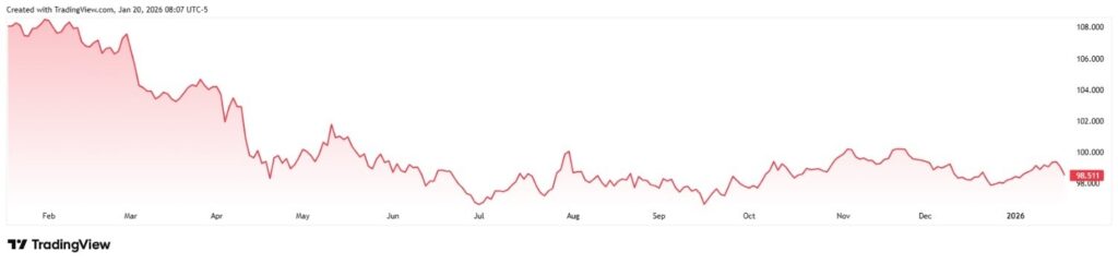 美元指数(DXY)暴跌低于其 200 天移动平均线(马萨诸塞州1月20日,**货币市场持续动荡,凸显了这一局面。