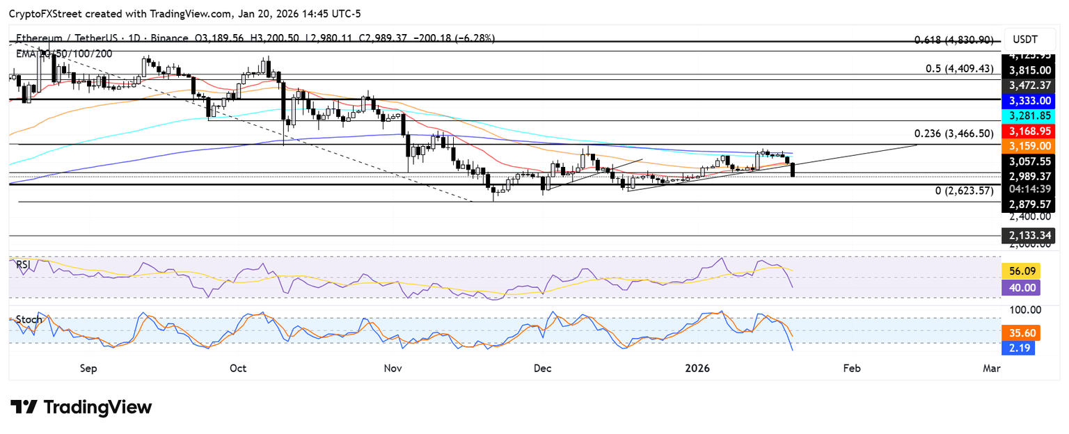 以太坊价格预测:ETH跌破关键上升三角形,目标支撑位在2880美元。