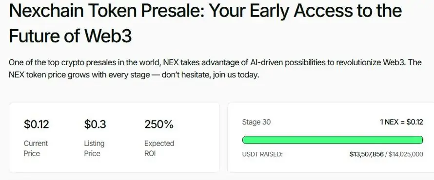 | NexChain ($NEX) | AI就绪型**层 | 网络使用情况、生态系统增长 | 人工智能基础设施、互操作性 | AI原生应用的基础层 |