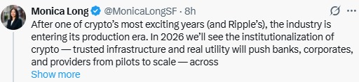 尽管价格下跌,Ripple Labs 却展现出强劲的信心。Ripple 总裁预测加密货币将进入迄今为止最重要的阶段,即所谓的“生产时代”。据莫妮卡·朗报道2026 年将是加密货币从测试和试点阶段过渡到大规模实际应用的一年。