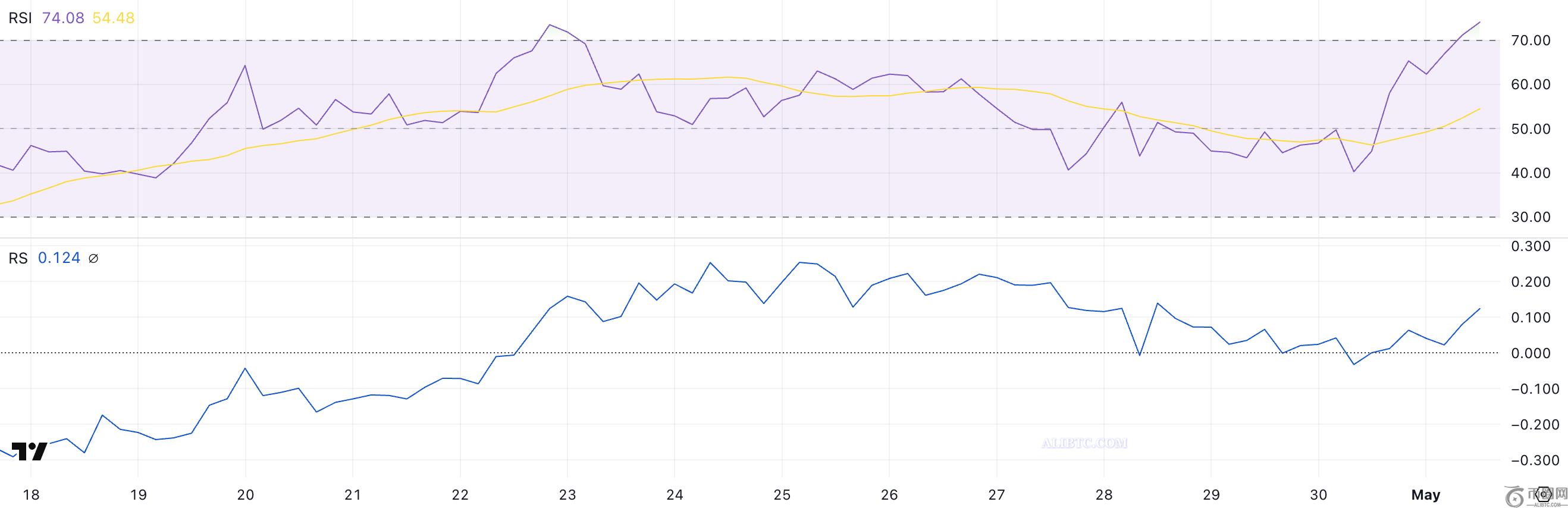 相对强弱 (RS) 将**的表现与基准进行比较。RS 高于 1.0 表示表现优于基准。低于 1.0 表示表现不佳。AIXBT 的 RSI 为 73.92,RS 为 0.69。从技术面来看,这使其处于超买状态,但仍落后于大盘。