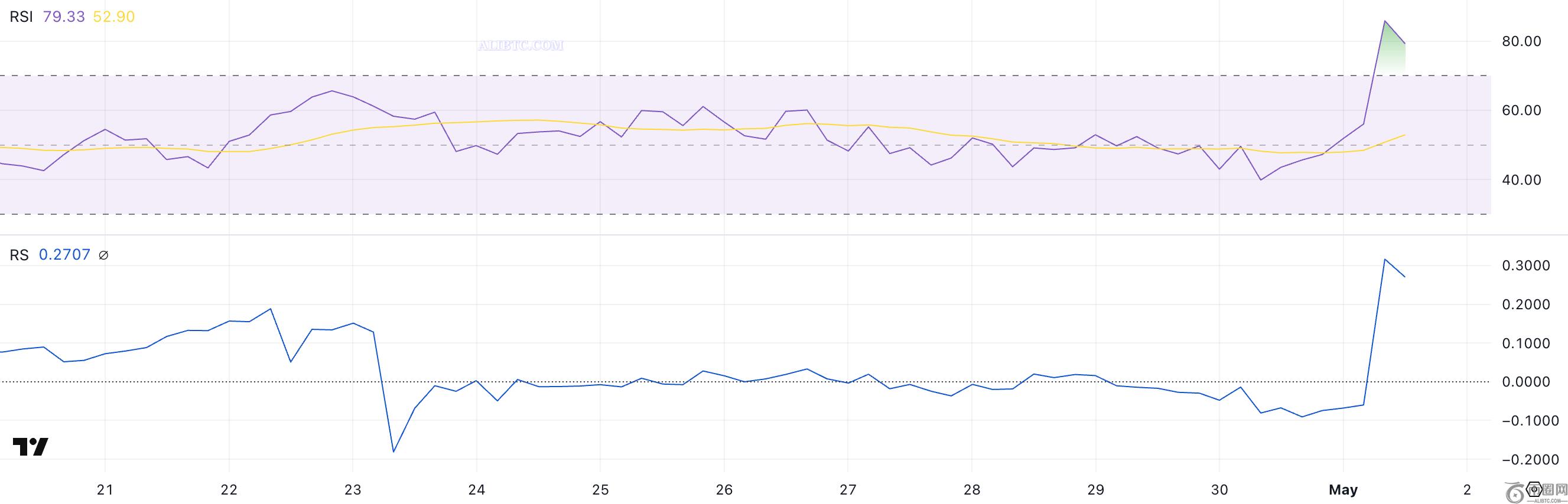 进入5月**周,AIXBT、Echelon Prime (PRIME) 和 Balancer (BAL) 等山寨币均大幅上涨,但关键技术指标目前显示,这三款币可能已超买。AIXBT 本周上涨近 95%,价格势头强劲,但其相对强弱度仍低于大盘。