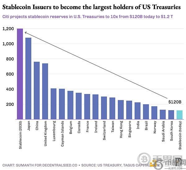 华盛顿同样心知肚明。花旗银行预测,在基准情景下稳定币市场规模将在2030年增长6倍至1.6万亿美元。美国财政部研究更显示,2028年该数字可能突破2万亿美元。若《GENIUS法案》强制要求80%储备金配置国债,"稳定美元"将取代中日成为美债**持有方。