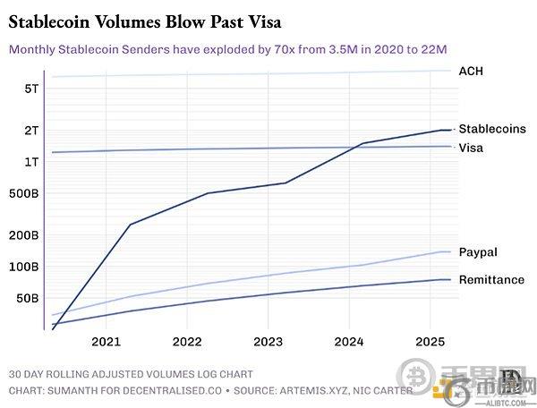 稳定币是配备公开区块链浏览器的当代欧洲美元。美元不再存放于伦敦金库,而是通过区块链"**化"。这种便利带来真实规模:2024年链上美元**结算额达15万亿美元,略超Visa网络。目前流通的2450亿美元稳定币中,90%为全额抵押的美元稳定币。