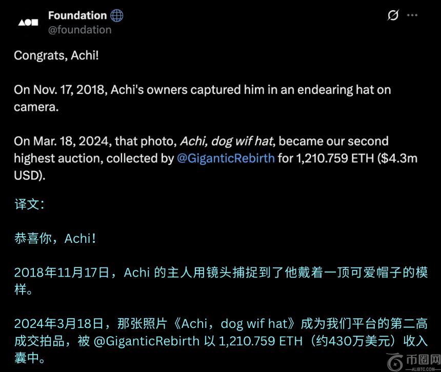 更早些时候,在2024年3月18日,这只「戴帽子的柴犬」曾被铸成NFT并登上Foundation平台的拍卖。**,由加密货币领域最**的交易员之一GCR以1210.759 ETH(约430万美元)的高价拍下,成为Foundation当时成交价第二高的拍卖作品。