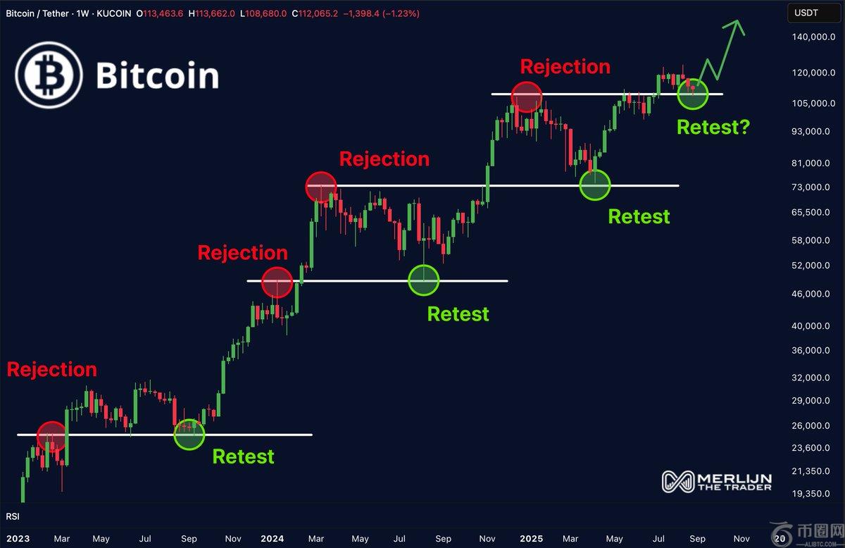 此外,分析师 Merlijn The Trader 相信最近的下跌趋势只是一次重新测试。他坚称,比特币正在重新测试1月份的阻力位,以巩固该区域作为下一轮上涨前的支撑位。